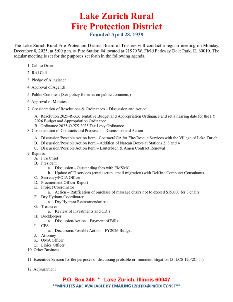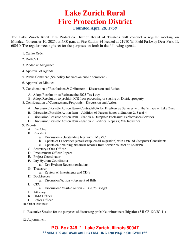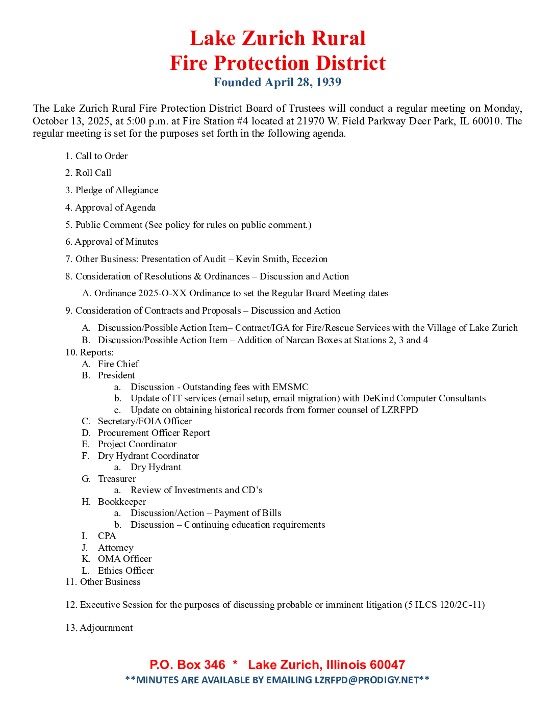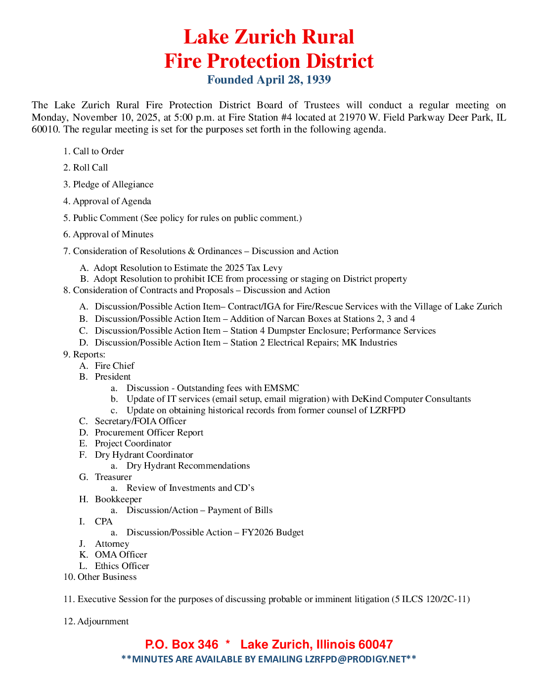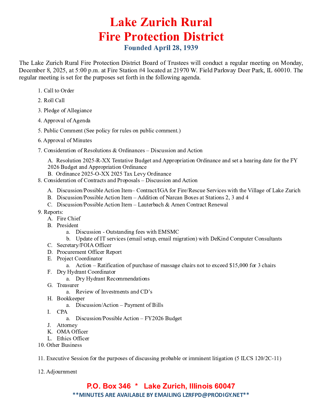 The Lake Zurich Rural Fire Protection District is responsible for protecting portions of the Villages of Hawthorn Woods, Deer Park, Kildeer, North Barrington, and Lake Barrington. As its own taxing body, it has successfully achieved this by contracting and working alongside the Lake Zurich Fire Department and the Village of Lake Zurich.